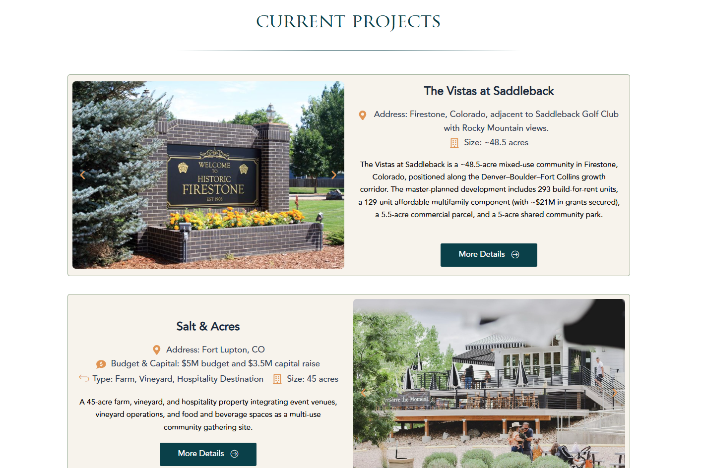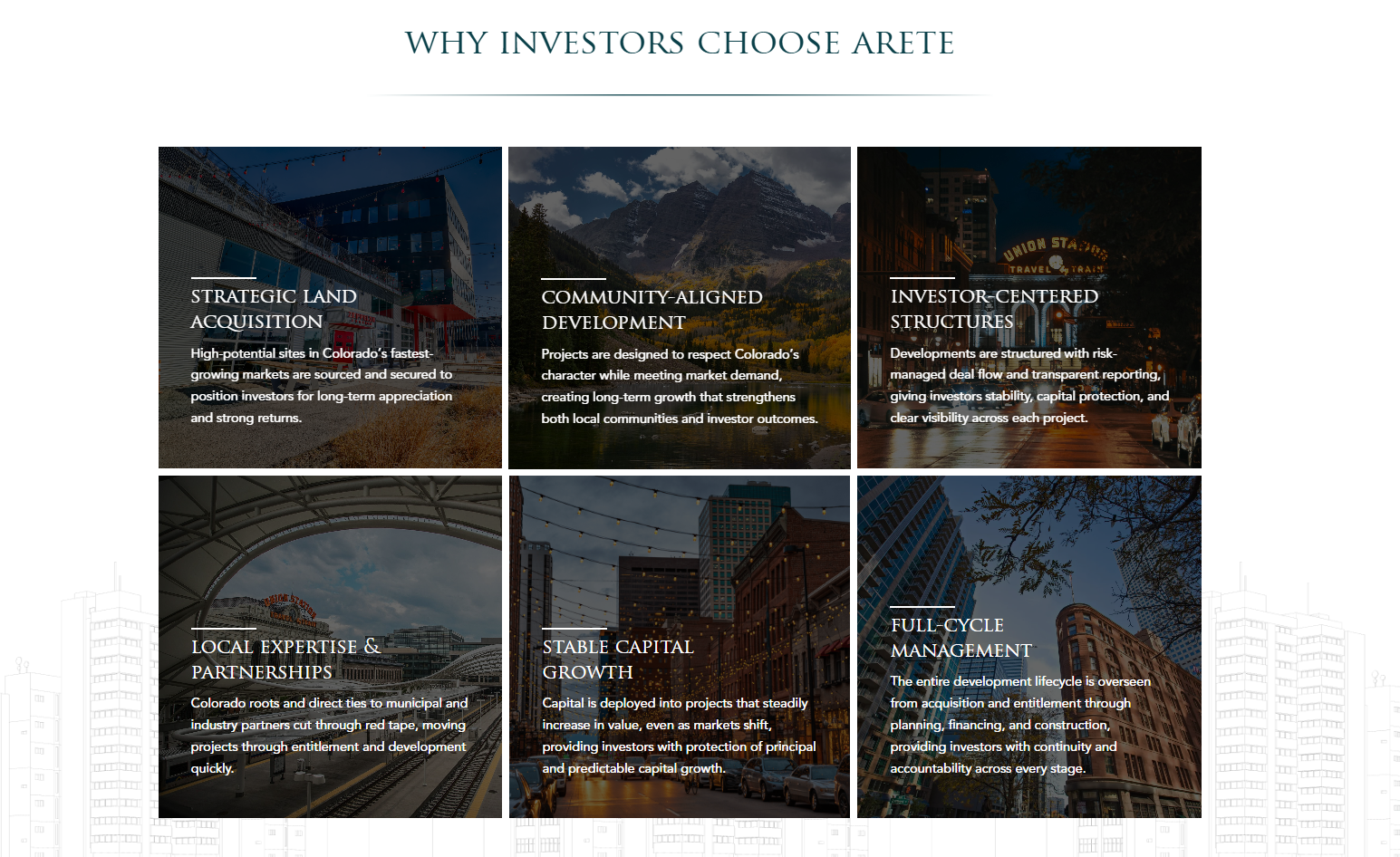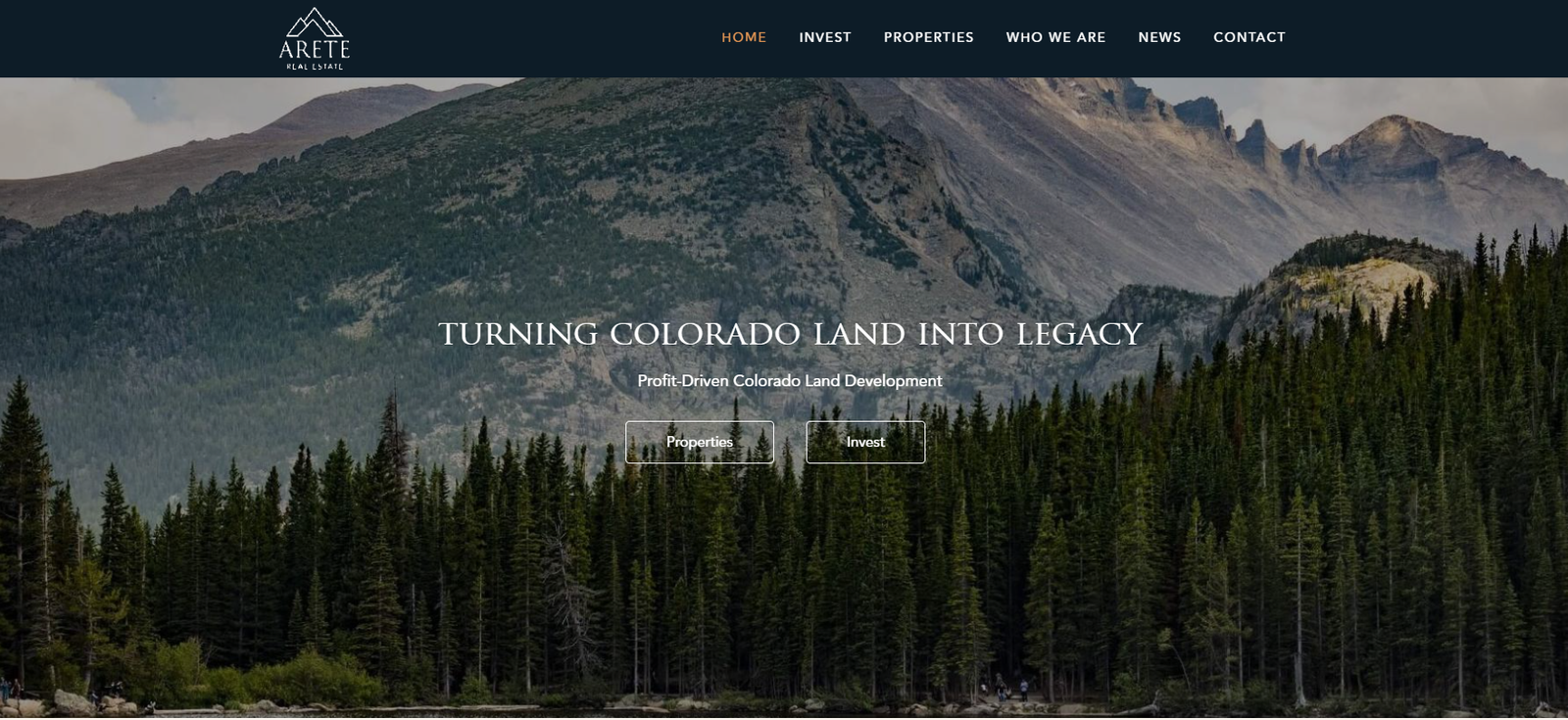 AreteRealEstate.co was built to highlight the company’s expertise in land development, property investment, and full-cycle project management — from acquisition and planning through development and exit strategies. The platform is designed to engage real estate investors by clearly outlining project opportunities, investment returns, and company competencies in Colorado’s growing markets.